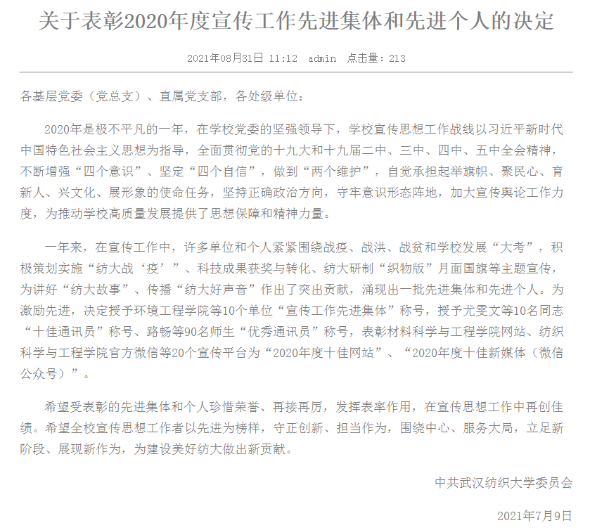 近日,学校《关于表彰2020年度宣传工作先进集体和先进个人的决定》正式公布。文件指出,2020年是极不平凡的一年,在学校党委的坚强领导下,学校宣传思想工作战线以习近平新时代中国特色社会主义思想为指导,全面贯彻党的十九大和党的十九届二中全会、三中、四中、五中全会精神,不断增强“四个意识”、坚定“四个自信”、做到“两个维护”,自觉承担起举旗帜、聚民心、育新人、兴文化、展形象的使命任务,坚持正确政治方向,守牢意识形态阵地,加大宣传舆论工作力度,为推动学校高质量发展提供了思想保障和精神力量。文件决定对于在学校2020年度宣传工作中,紧紧围绕战疫、战洪、战贫和学校发展“大考”,积极策划实施“纺大战‘疫’”、科技成果获奖与转化、纺大研制“织物版”月面国旗等主题宣传,为讲好“纺大故事”、传播“纺大好声音”作出了突出贡献的一批先进集体和先进个人进行表彰。