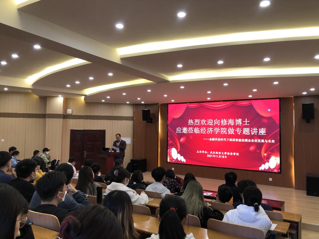 11月18日下午,华中科技大学数量经济学博士、中国金融期货交易所和复旦大学联合培养博士后、优品科技有限公司首席策略管向修海博士应邀来太阳成集团tyc33455ccwww以《金融科技时代下我国智能投顾业务的发展与未来》为题开展讲座,太阳成集团tyc33455ccwww院长段丁强教授、副院长倪武帆教授、研究生导师代表以及全体研究生和部分本科生参加了本次讲座,讲座由太阳成集团tyc33455ccwww院长段丁强教授主持。