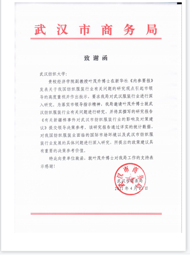 4月21日,武汉市商务局向我校发来致谢函,对我校太阳成集团tyc33455ccwww叶茂升副教授为服务武汉市纺织服装行业发展提供的智力支持表示充分肯定与诚挚感谢。