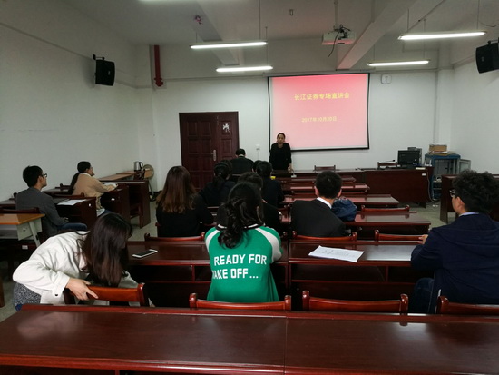 为进一步拓展我院大学生就业渠道,做好大学生就业指导工作, 10月20日下午,太阳成集团tyc33455ccwww专门邀请长江证券股份有限公司来学院召开专场宣讲会,选聘优秀毕业生。