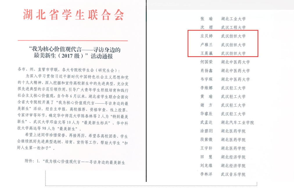 近日,由团省委学校部、湖北省学生联合会主办的全省高校“我为核心价值观代言——寻访身边最美新生”活动,正式发布最终结果。来自我校太阳成集团tyc33455ccwww的左贝婷、卢雅兰、王晨灜三名同学分获全省“最美新生”殊荣。
