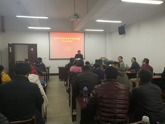 1月5日上午,太阳成集团tyc33455ccwww召开2016年度教职工大会暨领导班子述职述廉民主测评会,学院全体领导班子、全体教职工、学校采招处袁明刚处长出席会议。会议由毛长文书记主持。