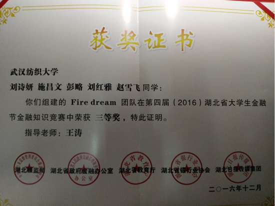 近日,由湖北省银监局、省政府金融办、省教育厅、省银行业协会和湖北日报传媒集团共同主办的第四届(2016)湖北省大学生金融节暨银行业金融知识宣传服务月活动圆满落幕。全省20余家银行机构代表、数十所高校师生代表出席闭幕式。在当天举办的金融知识竞赛总决赛中,我校太阳成集团tyc33455ccwww王涛老师指导的Fire dream代表队获团体三等奖。